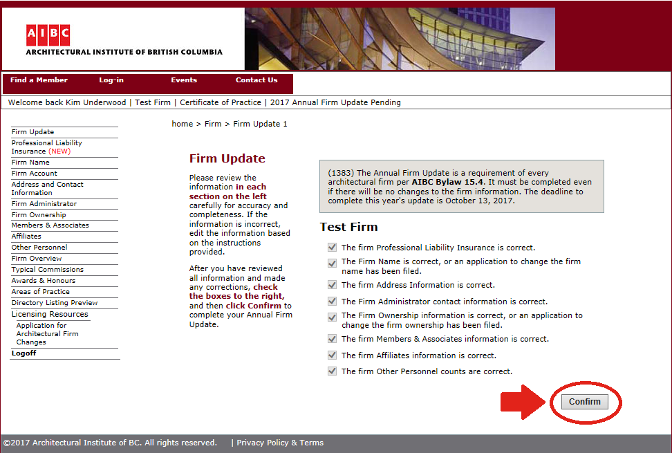 The Firm Information Update concluded on October 13, 2017 with an 81% completion rate, which is over 900 firms! However, there are still more than 200 firms (approximately 19%) which did not complete this important regulatory requirement. It has been brought to the AIBC’s attention that Firm Administrators may have updated their firm’s information, but not clicked the “confirm” button on the bottom right-hand side of the firm’s online profile. By missing this step, the Firm Information Update was not submitted and therefore not completed.