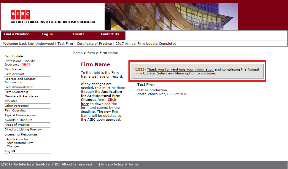 If you have any questions, please visit the AIBC Annual Renewal FAQ webpage or if you need assistance with firm updates, contact AIBC Licensing Coordinator Kim Underwood at firmupdates@aibc.ca.