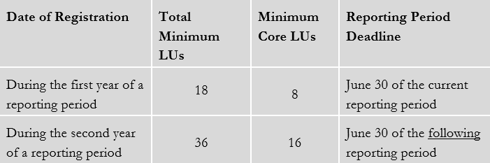 - The CES reporting period is two years. Participants need to earn and report a total of 36 LUs within this timeframe – with at least 16 being “Core” hours. If a participant earns more than the required amount, Core LUs can be carried forward into the next reporting period. It is being proposed that a maximum of 8 Core LUs can be carried forward.