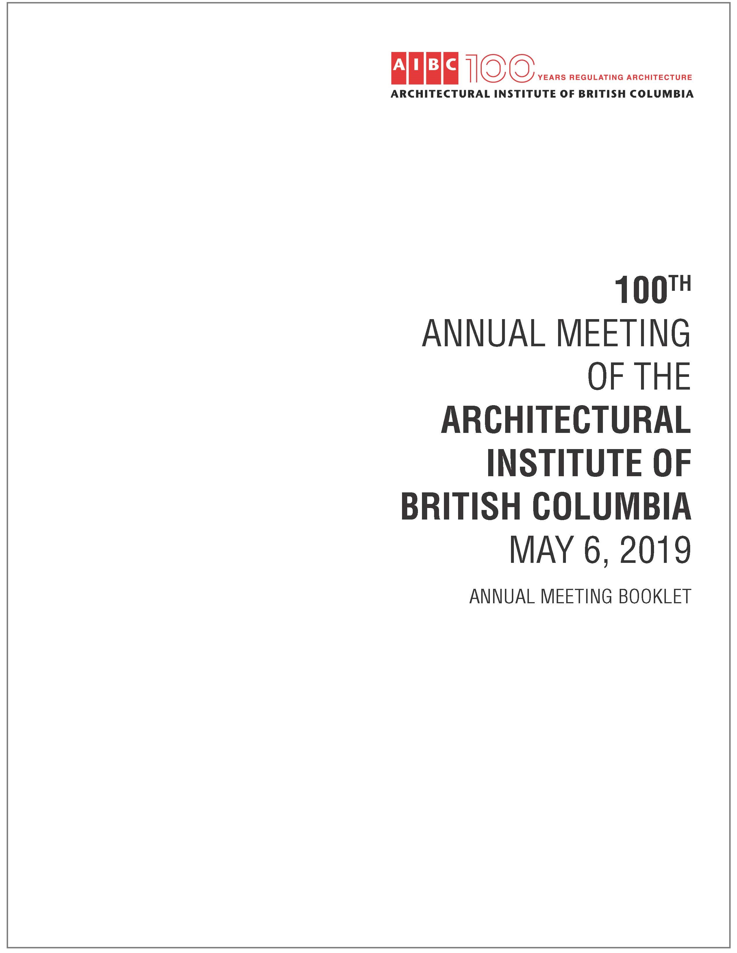 To submit a motion for review by the Motions Review Committee, refer to the Annual Meeting Booklet for Annual Meeting Protocols (page 4); a copy of the Member Motion Form can be found on page 5. Member motions submitted prior to the April 25, 2019 deadline can be sent to Tracy Tough at ttough@aibc.ca.